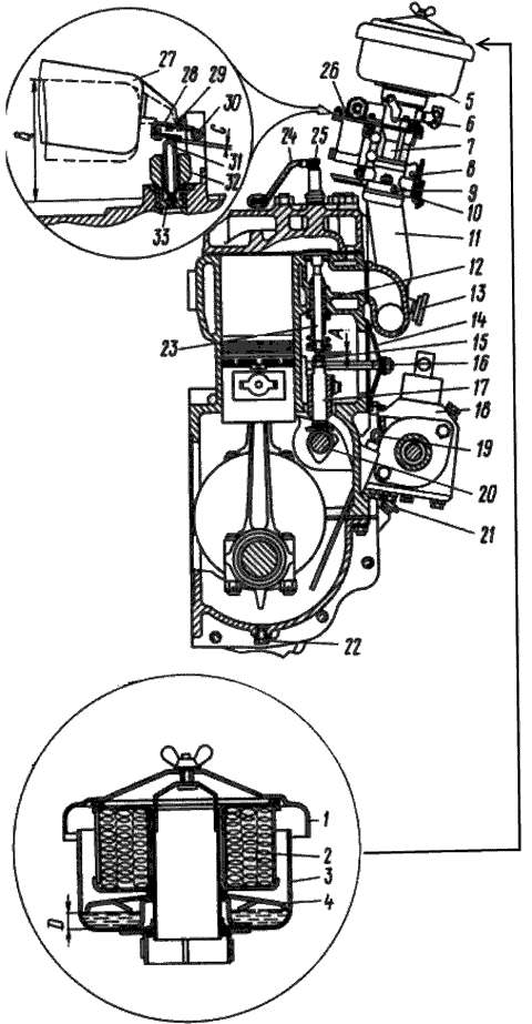 • проверить щупом зазоры между торцами клапанов 23 и регулировочных болтов 15 толкателей клапанов. Нормальная величина зазора 0,2-0,25 мм. При необходимости отрегулировать. Для этого ослабить контргайку 16 и вращением регулировочного болта 15 установить нормальный зазор. Затянуть контргайку и вторично проверить зазор;