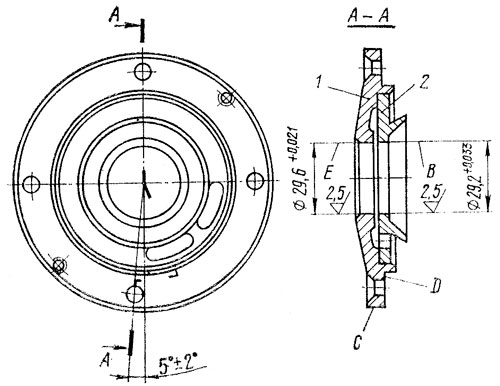 14. В диске уплотнения биение поверхности В (см. рис. 29) относительно оси поверхности С при опоре на поверхность D не более 0,06 мм; биение поверхности Е относительно оси поверхности С при опоре на "Поверхность D не более 0,04 мм.