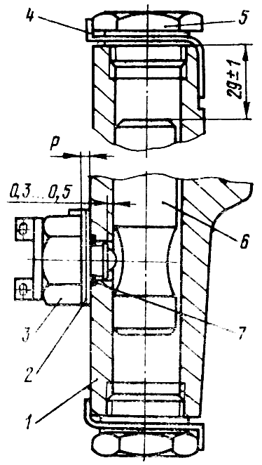 При нейтральном положении рычагов 20 с помощью приспособления 1 ( рис. 212 ) выставьте на размер (29±1) мм от торца малой бобышки проставки 2 валик 19 ( см. рис. 204 ). Закрепите через боковой люк рычаг 20 болтами 5 и законтрите их стопорной пластиной. Наденьте на пробку 5 ( см. рис. 211 ) стопорную шайбу 4, прокладку и заверните до отказа. Заверните аналогично пробки 5 в резьбовые отверстия остальных бобышек. Установите правый механизм переключения передач аналогично установке левого механизма переключения передач.