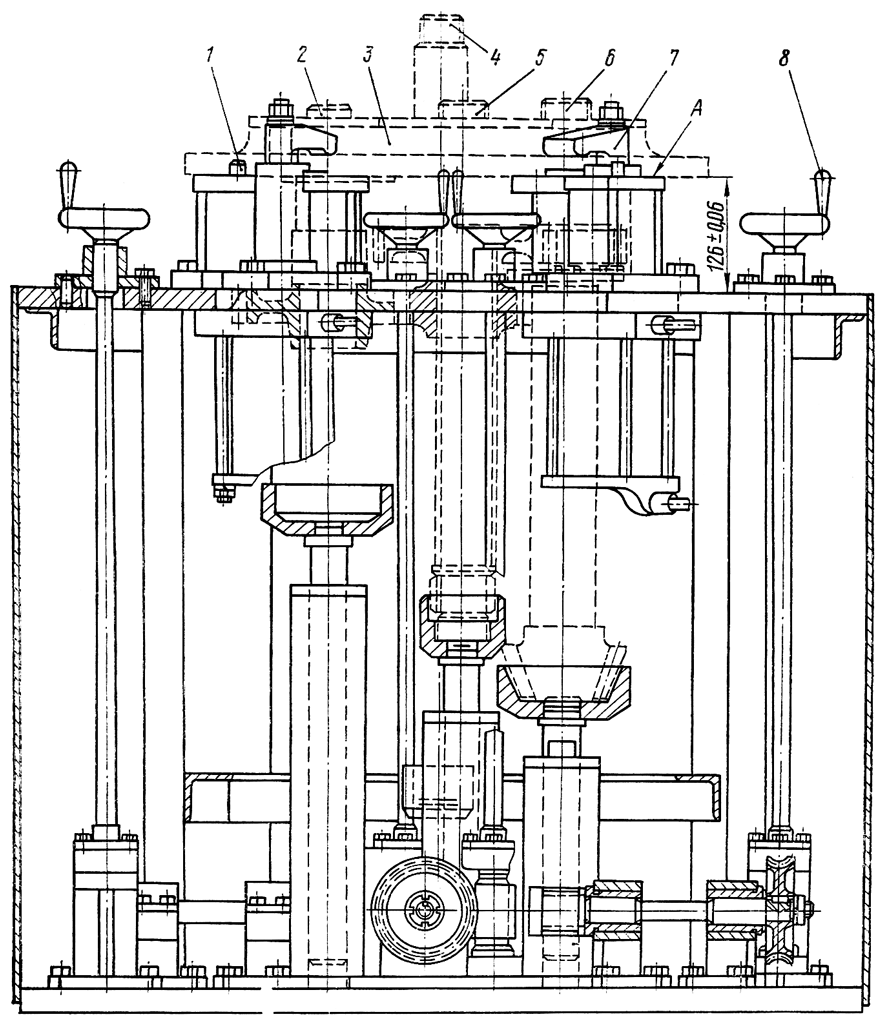 Установите верхний вал 4 ( см. рис. 206 ) коробки передач в приспособление так, чтобы расстояние от торца зубьев шестерни 7 ( см. рис. 207 ) до плоскости А приспособления (передней крышки) было (126±0,06) мм. Размер (126±0,06) мм установите с помощью шаблона.. Указанный размер обеспечивает в собранной коробке передач расстояние А=(126±0,5) мм ( см. рис. 205 ) от торца шестерни 7 ( см. рис. 207 ) до внутреннего торца передней крышки.