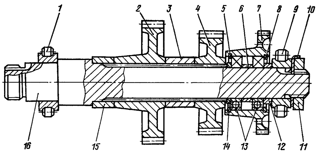 Установите крышку 16 и закрепите ее вместе с корпусом подшипников болтами с пружинными шайбами. Нагрейте фланец 13 до температуры 523...543 К (250...270 °С) и напрессуйте на вал. Наверните гайку 11 с левой резьбой на вал до упора во фланец 13, вверните два стопорных болта с пружинными шайбами. Проверьте, нет ли задевания маслосгонной резьбы за крышку подшипников, проворачивая верхний вал.