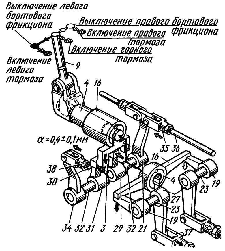 Пробуксовывают бортовые фрикционы Отрегулировать привод к муфтам поворота