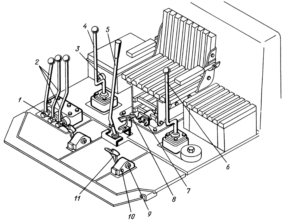 Двигателем, агрегатами и механизмами трансмиссии, рабочим и дополнительным оборудованием трактора управляют с помощью рычагов, педалей, рукояток, кнопок (рис. 1 и 2).